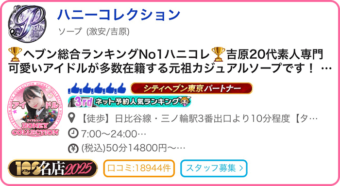 アイドルがコンセプトの吉原屈指の有名店!ヘブンネットランキング東京総合で上位獲得の人気店なので集客力抜群で稼げます!お部屋はリニューアルしていて綺麗で可愛く、12部屋ある大型店です!可愛い制服でお仕事ができます!